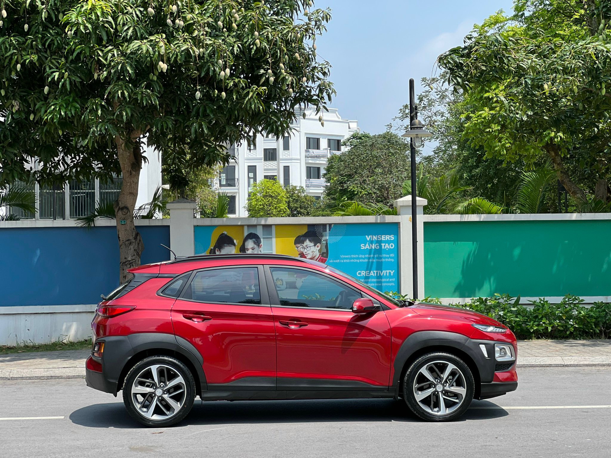Nhấn nhá thêm tính thể thao cho Hyundai Kona 2019 là những đường gân dập nổi chạy dọc phần thân, thanh gá nóc, đuôi gió phía sau cùng những tấm ốp bảo vệ màu đen ở các hốc đèn và viền bánh.