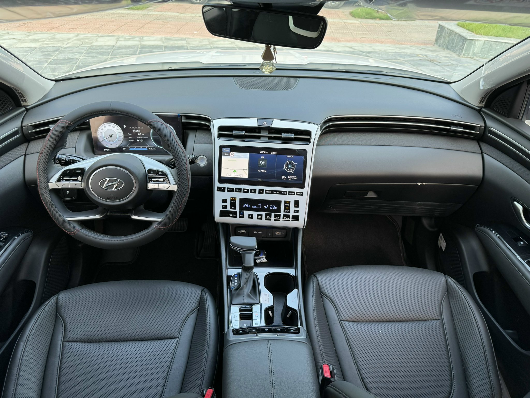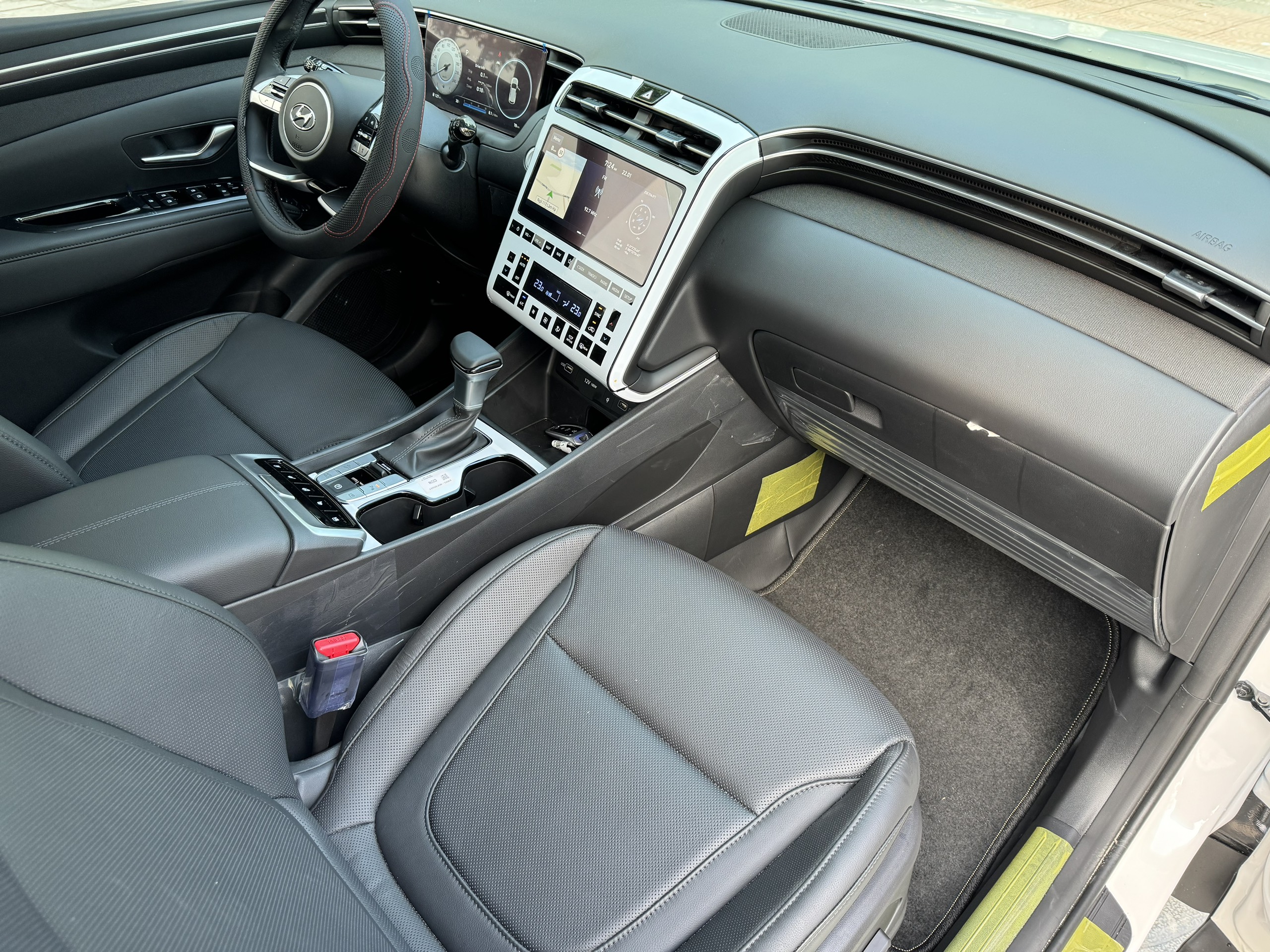 Khu vực taplo có thiết kế tương tự “đàn anh” SantaFe với sự phân tách thành 2 tầng uốn cong, trải sang hai bên tạo ấn tượng rộng rãi cho khoang lái. Trong đó, tầng phía trên bố trí các cửa gió nhỏ đặt ẩn tinh tế, giúp điều hướng luồng gió đều và sâu hơn. Tầng dưới bao gồm cụm điều khiển trung tâm và màn hình nổi kích thước lớn đậm chất công nghệ.