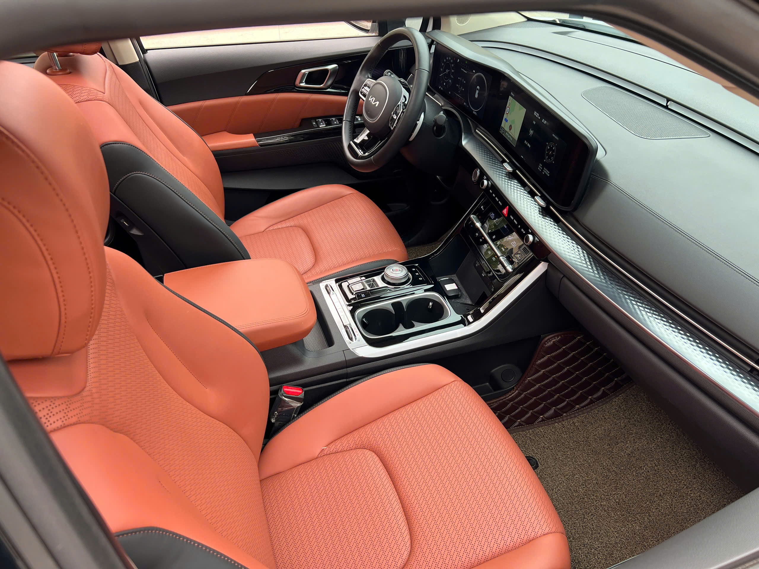 Kia Carnival 2022 có không gian nội thất khoa học, rộng rãi và sang trọng: Khoang lái đậm chất công nghệ với cụm màn hình đa thông tin 12.3 inches, nút xoay chuyển số điện tử giúp thao tác thuận tiện.