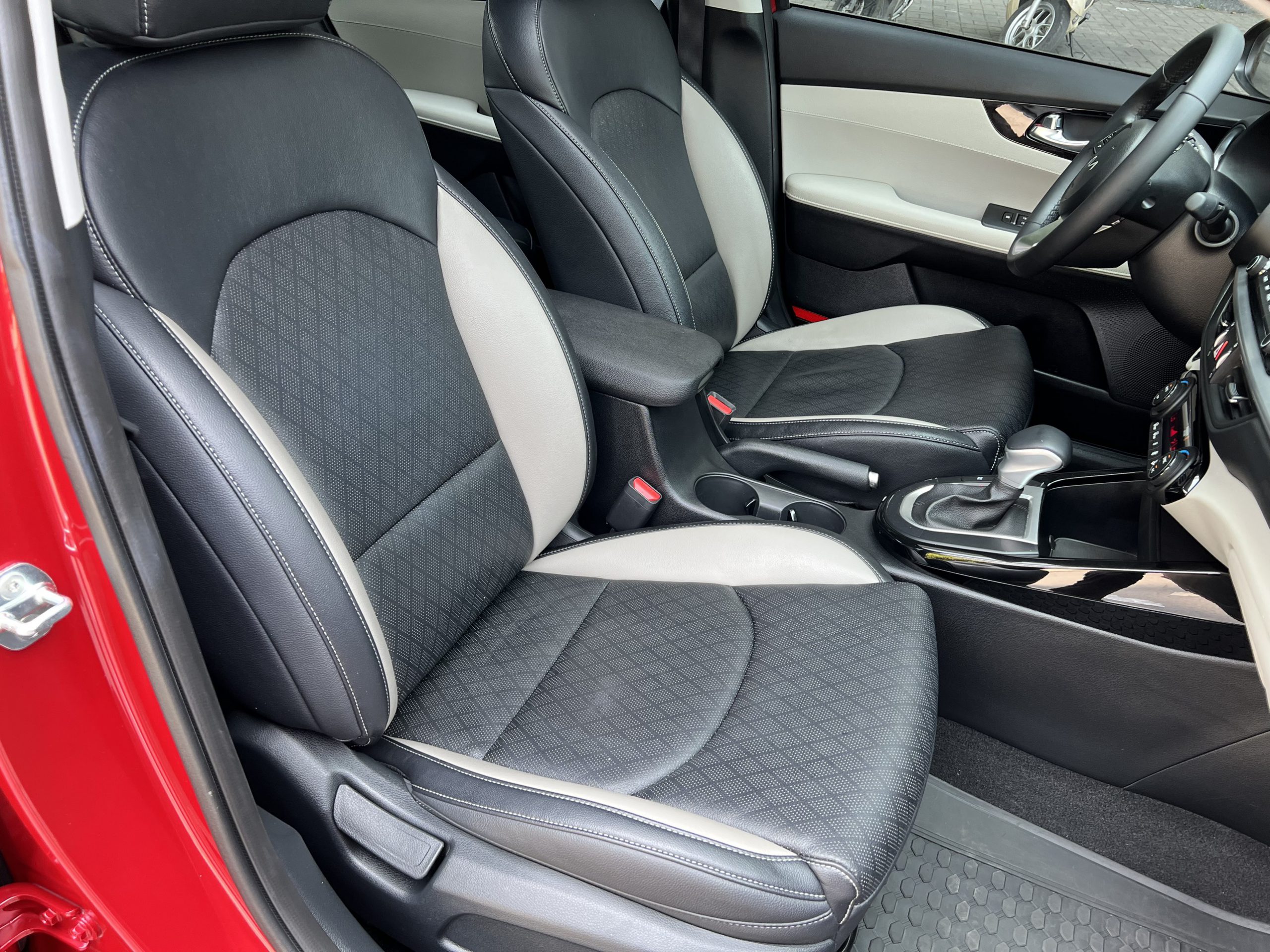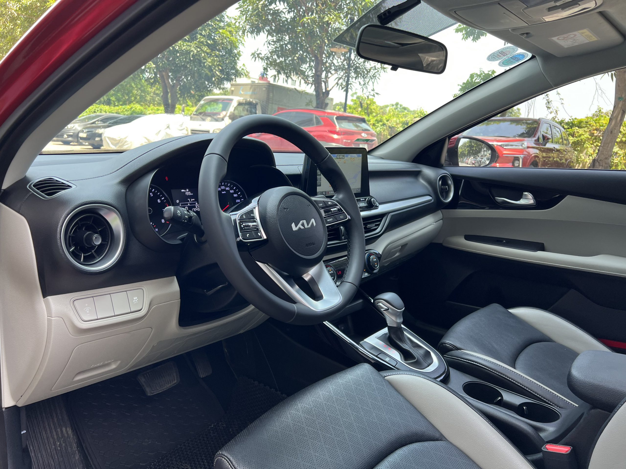 Khoang cabin của KIA K3 2022 mang phong cách đơn giản, trung tính và dễ nhìn. Các chi tiết được sắp xếp và dàn trải theo chiều ngang, góp phần nhấn mạnh độ rộng thoáng của xe. Chất liệu da tối màu kết hợp các mảng nhựa mềm xuất hiện xuyên suốt khoang lái của tất cả các phiên bản. Riêng hai phiên bản 1.6 Premium và 2.0 Premium sẽ trang bị nội thất 2 tone đen – đỏ thể thao. Đây là điểm nhận nhiều ý kiến trái chiều từ khách hàng do không phải ai cũng thích phong cách thể thao từ nội thất đỏ.
