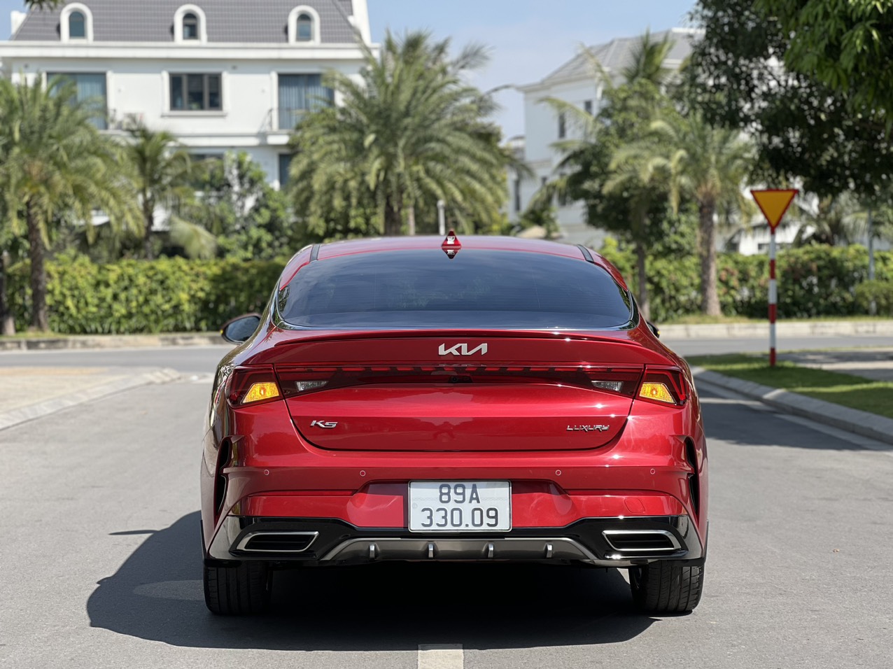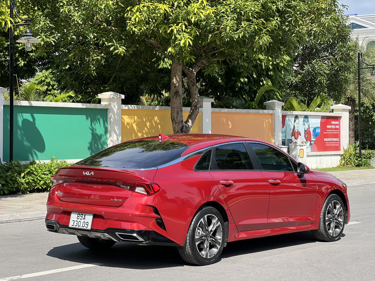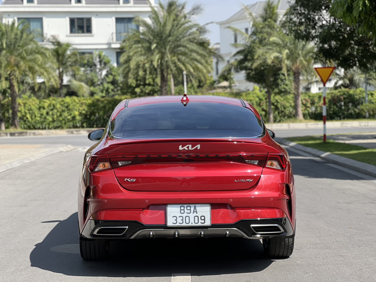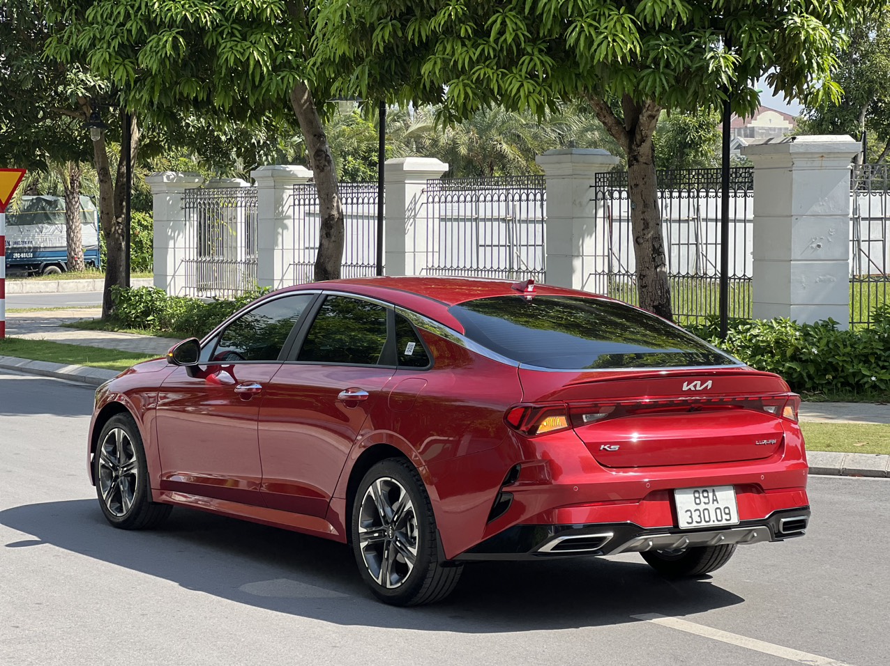 Phần đuôi của Kia K5 tiếp tục mang lại những đường nét thể thao, cá tính và hiện đại. Rất nhiều đường kẻ ngang ở phần đuôi tạo nên sự đồng bộ trong thiết kế. Từ cụm đèn hậu sử dụng công nghệ LED được nối liền 2 bên với kiểu dải đèn được làm kiểu “Heartbeat”; cho tới những đường gân dập nổi tạo ra vẻ ngoài ấn tượng, trẻ trung.