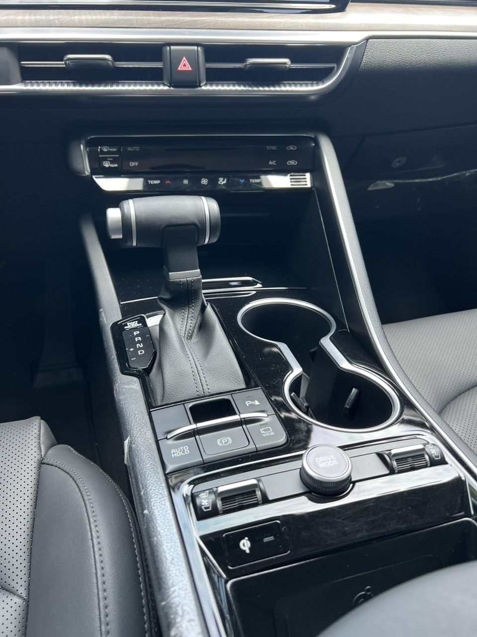 Khu vực “yên ngựa” ở giữa được thiết kế khá sang trọng với sự kết hợp giữa ốp nhựa đen và các đường viền nhôm. Cần số được làm khá thể thao với độ cầm nắm vừa tay, trên cần số có thêm nút O/D Off giúp xe có thể vận hành an toàn khi đi đèo dốc. Xung quanh khu vực cần số cũng có hàng loạt các nút bấm hỗ trợ lái như: Phanh tay điện tử, Auto Hold, núm xoay đổi chế độ lái…
