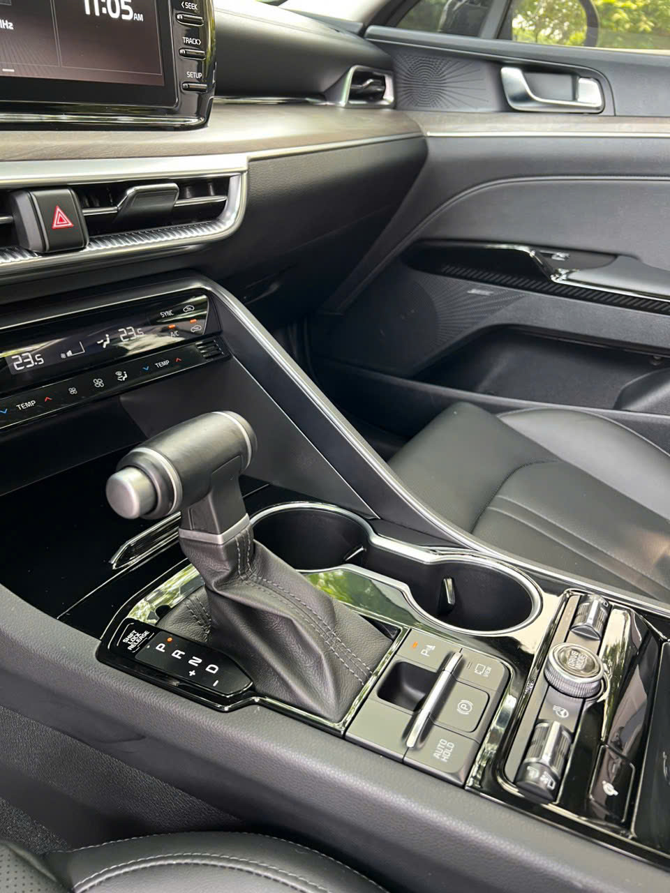 Khu vực “yên ngựa” ở giữa được thiết kế khá sang trọng với sự kết hợp giữa ốp nhựa đen và các đường viền nhôm. Cần số được làm khá thể thao với độ cầm nắm vừa tay, trên cần số có thêm nút O/D Off giúp xe có thể vận hành an toàn khi đi đèo dốc. Xung quanh khu vực cần số cũng có hàng loạt các nút bấm hỗ trợ lái như: Phanh tay điện tử, Auto Hold, núm xoay đổi chế độ lái…
