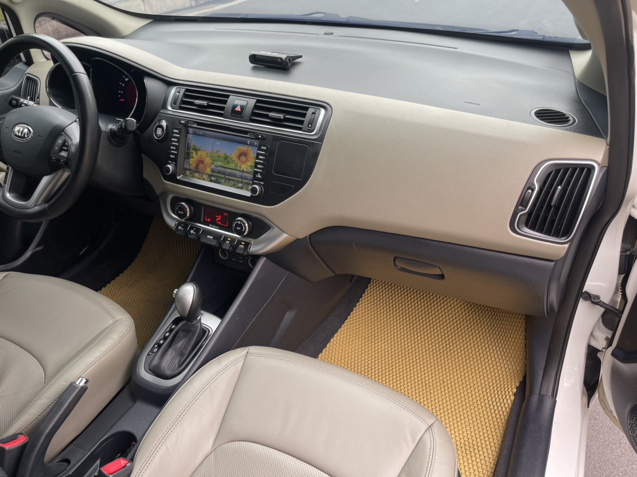 Bên trong cabin xe, Rio Hatchback 2015 được trang bị ghế xe bọc da cao cấp, tay lái bọc da tích hợp các phím điều khiển hệ thống giải trí, điện thoại rảnh tay và hệ thống ga tự động. Xe trang bị hệ thống giải trí màn hình hiển thị đa thông tin DVD, GPS, các cổng kết nối đa phương tiện AUX, USB, iPod , Bluetooth giúp kết nối thiết bị bên ngoài, hệ thống âm thanh 6 loa. Hệ thống điều hòa tự động với chức năng lọc khí bằng ion, cửa sổ trời điều chỉnh điện.