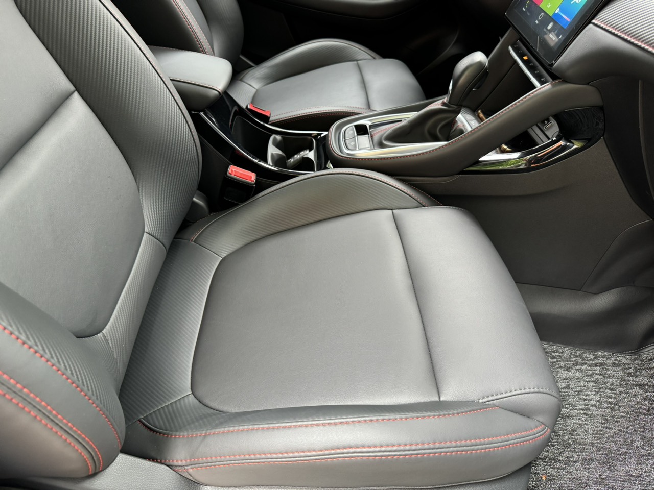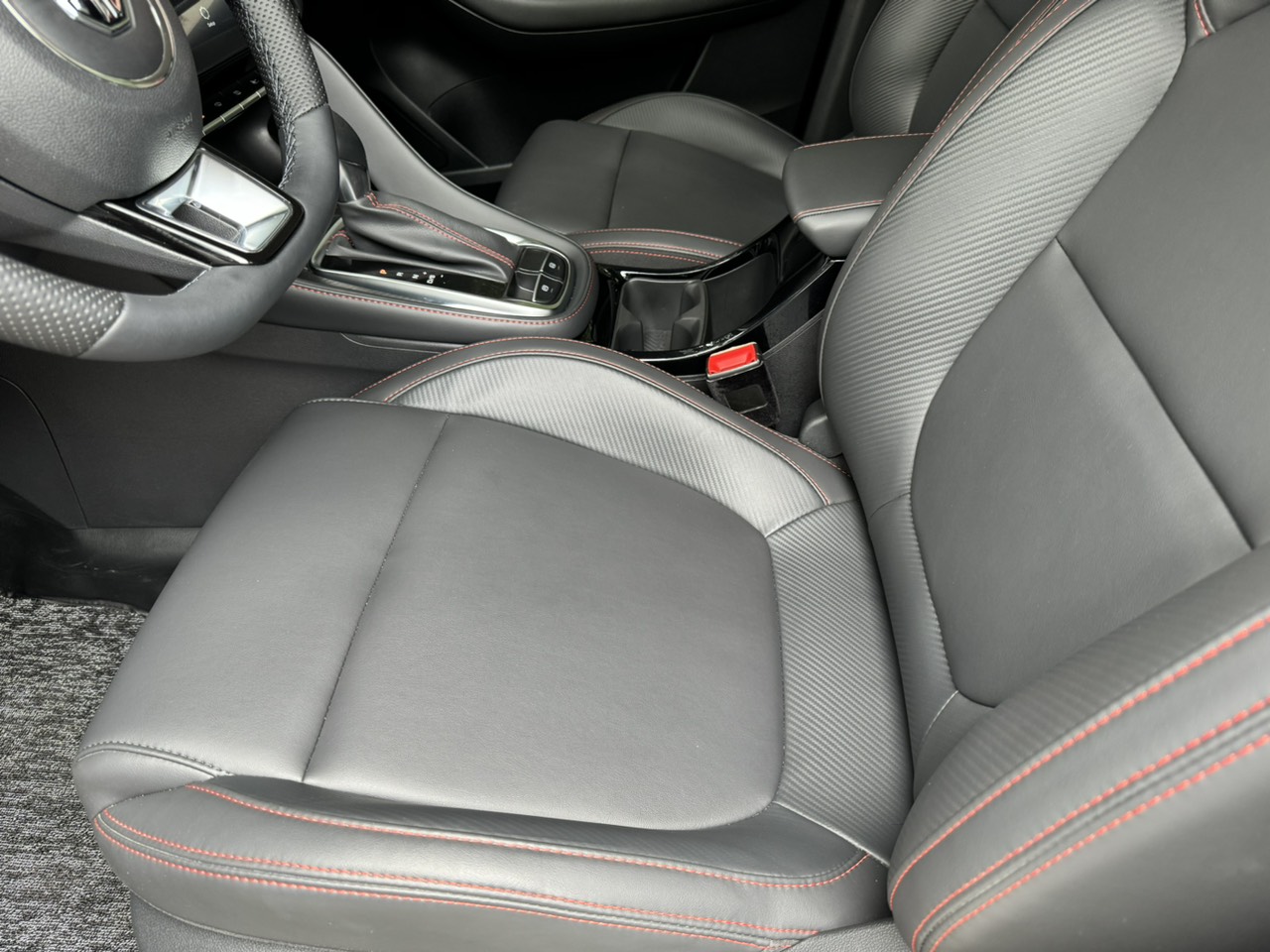 Khu vực taplo có kiểu thiết kế bất đối xứng theo dạng chữ “T”, nối liền ôm trọn cụm cần số. Mặt taplo phía trên phẳng, sử dụng nhựa mềm giả da cho cảm giác cao cấp. Phần bên dưới làm từ da thật được trang trí những đường chỉ đỏ thể thao, kết hợp họa tiết carbon đẹp mắt.