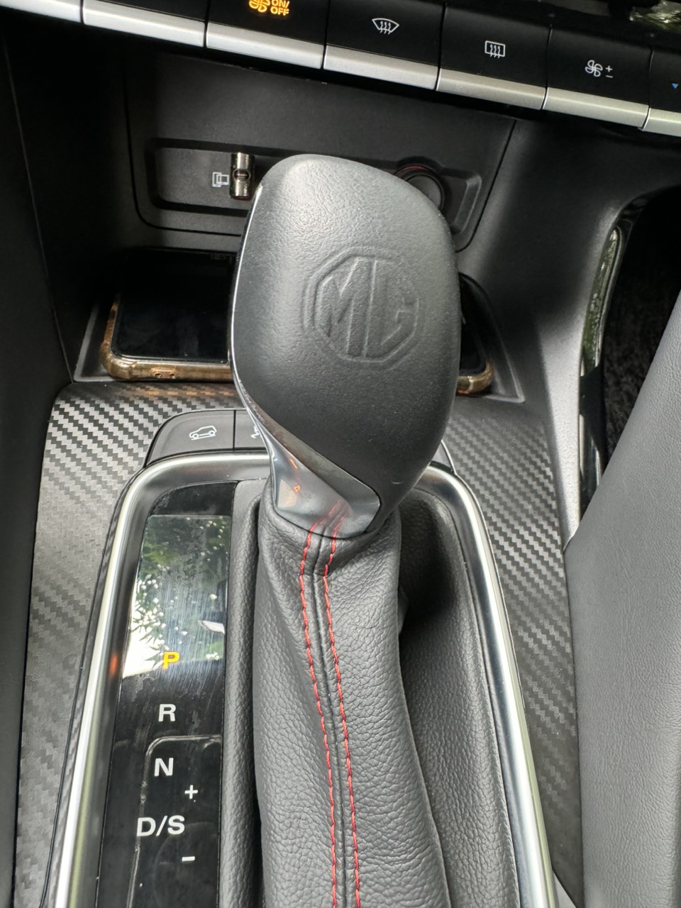 Cần số dạng cơ khắc biểu tượng MG với phần chân được bọc da. Một khung màu bạc bao bọc lấy chi tiết này và các nút chức năng xung quanh thể hiện thiết kế tinh giản, hiện đại. Hai hốc để đồ nho nhỏ tại đây cũng giúp tăng thêm sự tiện nghi cho khách hàng.