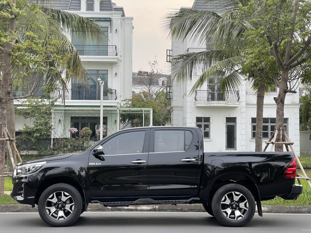 Tiến tới bên hông xe, Toyota Hilux vẫn giữ nguyên thiết kế thuần xe bán tải với các góc vuông và đường thẳng nằm ngang từ trước ra sau. Nổi bật trên thân xe là các đường dập chìm giúp tăng vẻ cơ bắp.