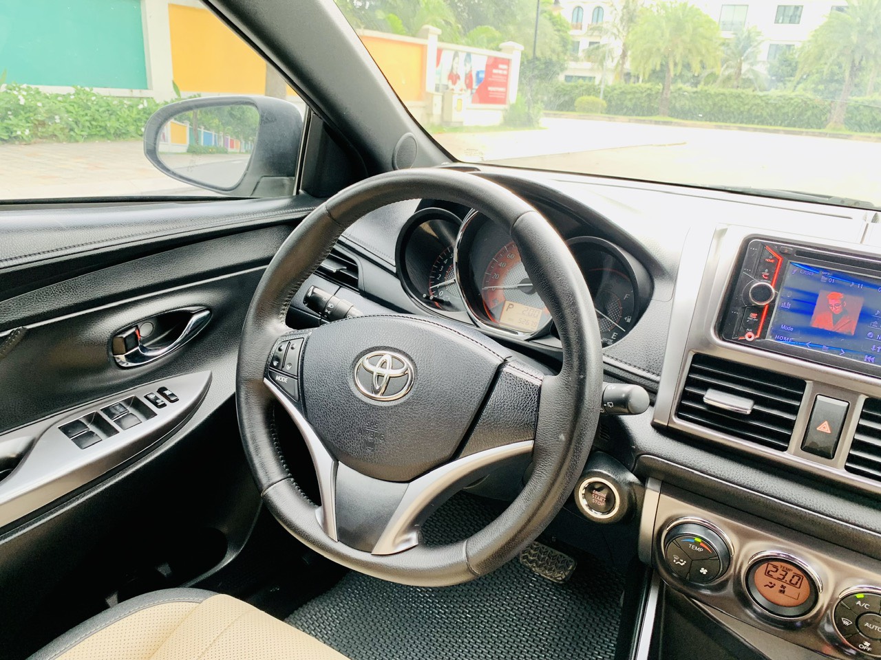 Vô-lăng 3 chấu trên Toyota Yaris có thiết kế thể thao với điểm nhấn là chi tiết mạ bạc. Phiên bản 1.3G vô-lăng được bọc da tích hợp các nút bấm điều khiển hệ thống âm thanh và giải trí tiện dụng. Phiên bản 1.3E bị “trọc” ở vị trí này.